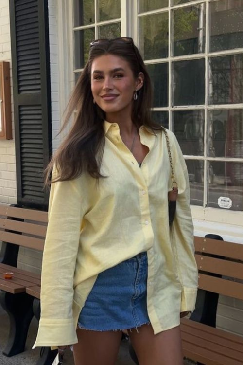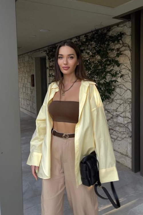 Throw a butter yellow oversized shirt over a crop top and pants for effortless layering. Pro tip: Leave it unbuttoned for a relaxed look and roll up the sleeves for that casual, editorial feel.