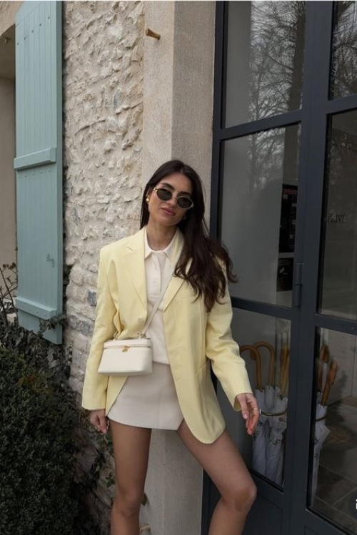 Elevate a classic mini skirt with a butter yellow blazer and polo tee combo. Pro tip: Mix textures—think soft knit tee with structured blazer—to keep it visually interesting.