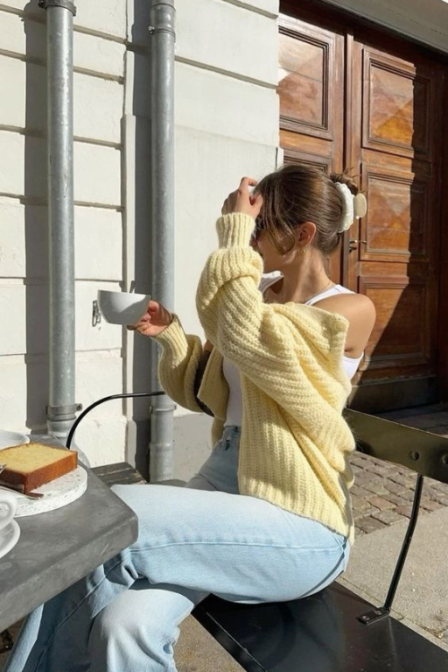 Butter yellow knit cardigans over a simple top and denim are a cozy-cool go-to.