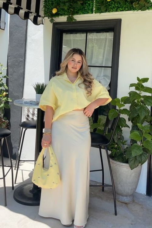 Butter yellow shirts paired with a satin maxi skirt are perfect for day-to-night elegance. Styling tip: Knot the shirt or tuck it in to highlight your waist and accessorize with delicate gold jewelry.