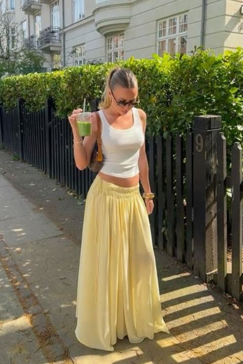 A butter yellow tank with a flowing maxi skirt is the ultimate easy-breezy outfit. Styling tip: Add delicate jewelry to keep the look light, fresh, and editorial.