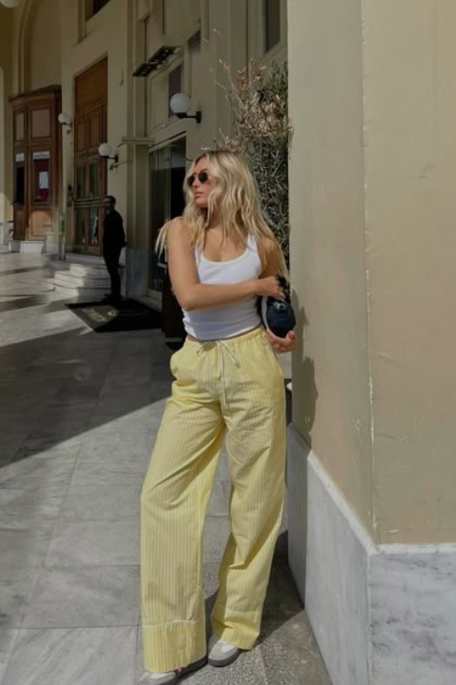 Keep it minimal with a tank and a butter yellow linen pants. Styling tip: Carry cute bag for a subtle touch of elegance. Perfect for warm days when comfort meets style.