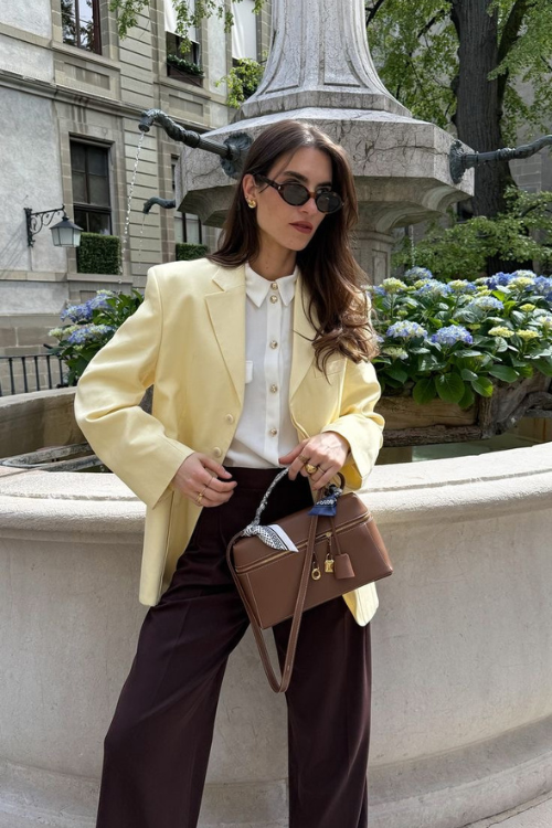 Take butter yellow to work-ready chic with a blazer over a shirt and pleated pants. Pro tip: Accessorize with a structured bag for an editorial, put-together vibe.
