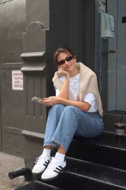 Think: Saturday coffee run, but make it chic. The Sambas give this easy sweater-and-jeans combo that “I actually planned this” edge. Add a structured bag to dress it up just a smidge.