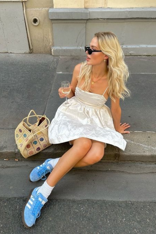 Who says sporty can’t be luxe? A satin co-ord set paired with clean Spezial sneakers gives silky vibes with a hint of street cred. Pro tip: Keep accessories minimal — let your shoes do the talking.