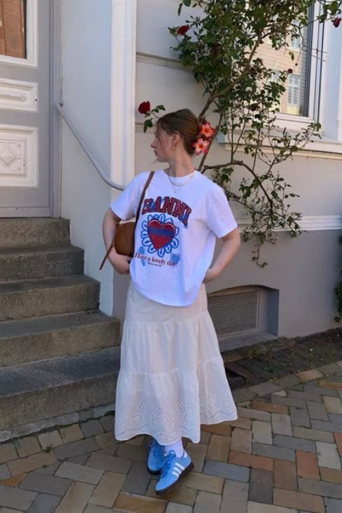 Effortless contrast. A bold graphic tee paired with a flowing maxi skirt turns casual into editorial chic.