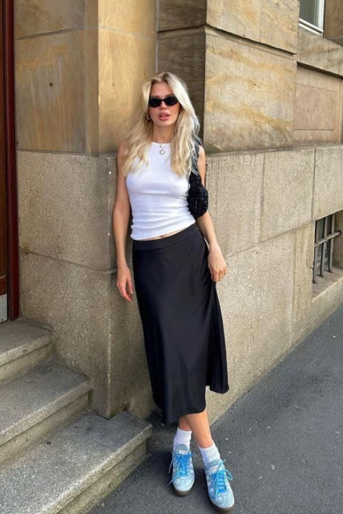 Casual-meets-luxe energy. A soft tee paired with a satin skirt and Spezial shoes balances femininity with sporty ease.