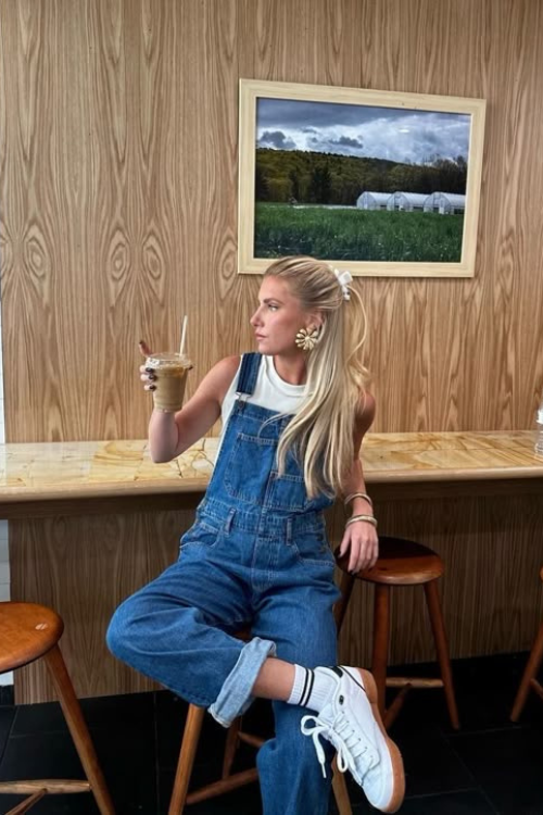 Denim dungarees over a basic tee are timeless, practical, and perfect for spring layering. This outfit is comfy but still looks styled, especially with clean sneakers or sandals.