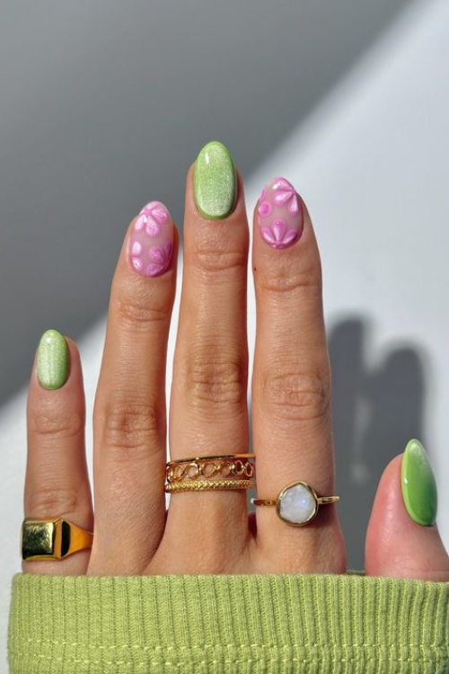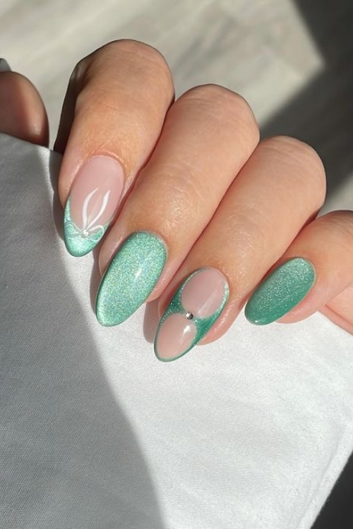 Unexpected but totally chic — think spring vibes with a cat eye glow. Pro Tip: Use a metallic green magnetic polish paired with blush pink accents for a trend-forward finish.