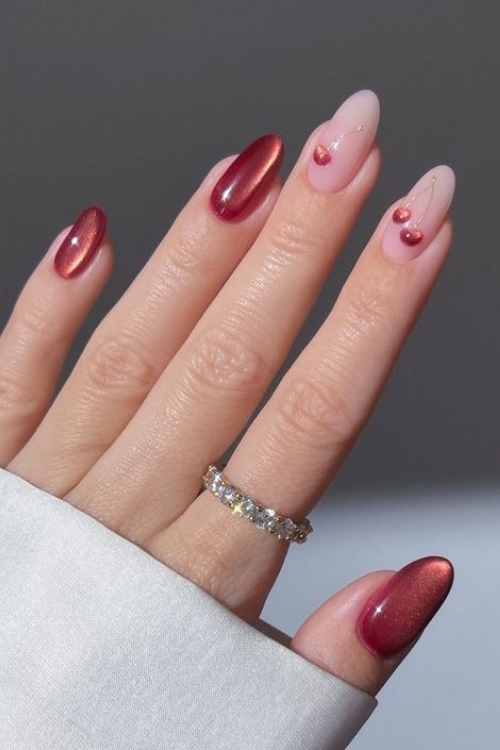 Think bold red meets sultry shimmer — it’s playful, fiery, and totally statement-worthy. Pro Tip: Add tiny cherry accents or gems for a Pinterest-worthy twist.
