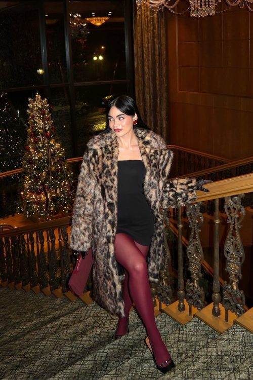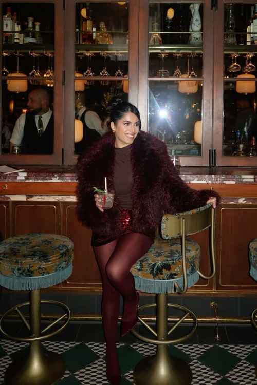 Nothing says luxe holiday drama like plush fur thrown over rich velvet. This look feels equal parts glam and cozy, ideal for chilly December nights.