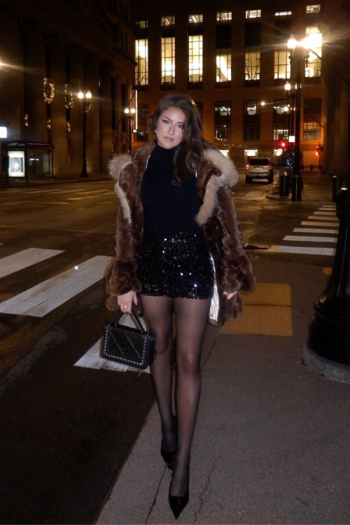 This look is equal parts cozy and glam. The fur jacket softens the sparkle of sequin shorts, making it chic rather than over-the-top.