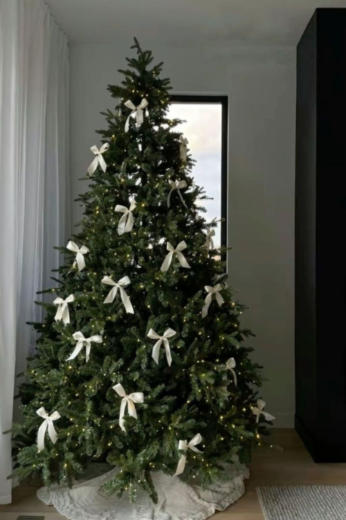 A giant white bow creates a fresh, wintry focal point. Works beautifully on green, blue, or pastel-themed trees.
