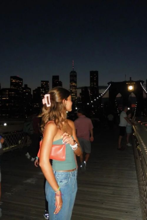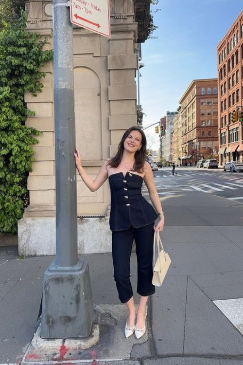 A spaghetti strap top with white jeans feels light yet sharp against the city backdrop. Perfect for warm evenings or rooftop dinners when you want something sleek.