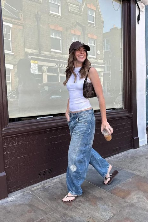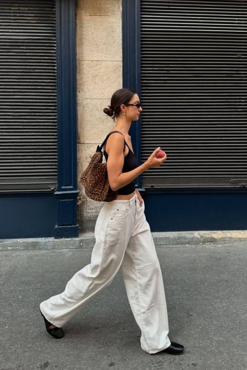 A striped tank with white jeans feels crisp against the city’s concrete backdrop. It’s perfect for anyone who loves a clean, classic base with subtle edge. Choose thicker white denim and a slightly boxy tank so the look feels intentional, not flimsy.