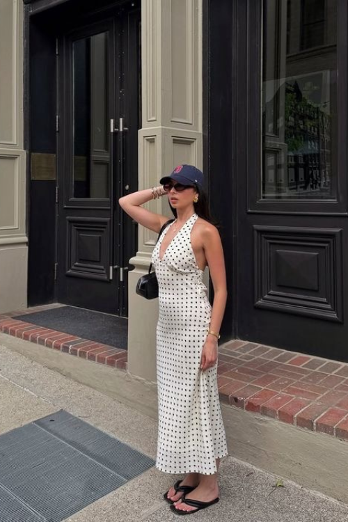 A polka dot maxi dress paired with a baseball cap balances feminine and sporty in the best way. This look suits anyone who loves playful prints but wants edge.