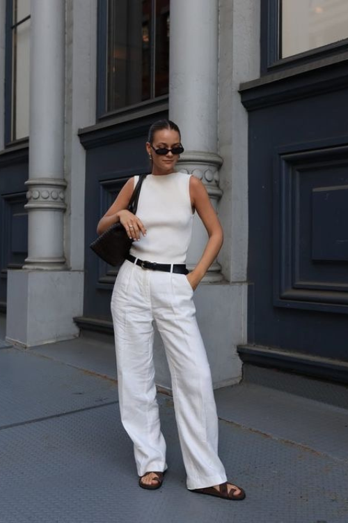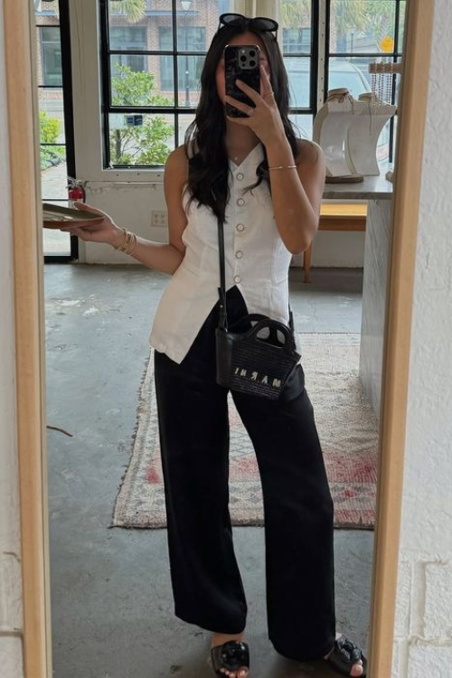 A linen vest top with black pants blends summer texture with strong structure. It’s great for city days that turn into dinner plans.