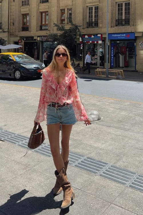 A boho-inspired top with denim shorts adds softness to a city-ready base. This works beautifully for heatwave days when breathability matters.