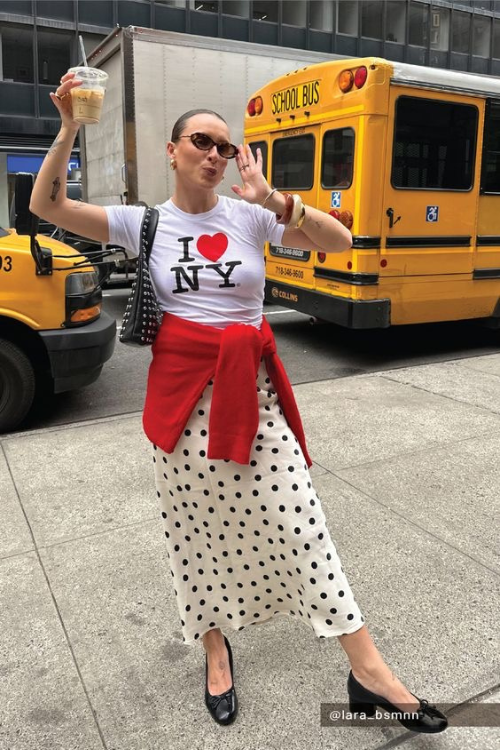 An NYC tee with a polka dot skirt blends graphic cool with vintage charm. It’s perfect for creative girls who like mixing casual and classic. Tuck the tee neatly and let the skirt hit mid-calf or above the knee for balanced proportions.