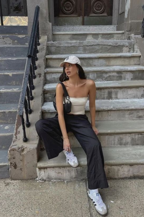 A cropped tank with black trousers blends sporty ease with sharp tailoring. It’s perfect for city girls who want something cool but elevated. Make sure the crop hits just above the waistband so the proportions feel balanced and intentional.
