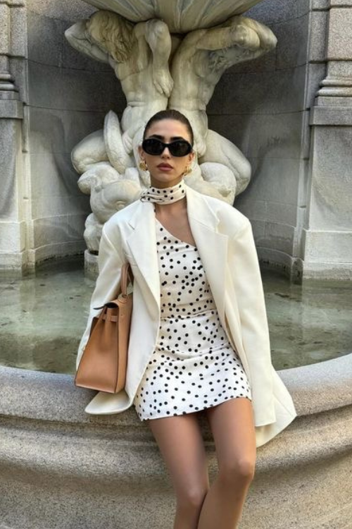Polka dots meet power dressing — and the result is pure magic. The blazer sharpens the playful charm of a polka dress, creating the perfect high-low mix.