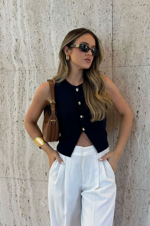 This is the “rich girl running errands in Milan” outfit. A simple, well-fitted tank top with pullover draped on your shoulders and pleated pants exudes effortlessness.