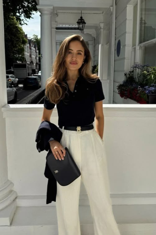 The polo tee is the definition of understated luxury — simple, preppy, and timeless. When paired with tailored pants, it becomes rich aunt who plays tennis on weekends energy.