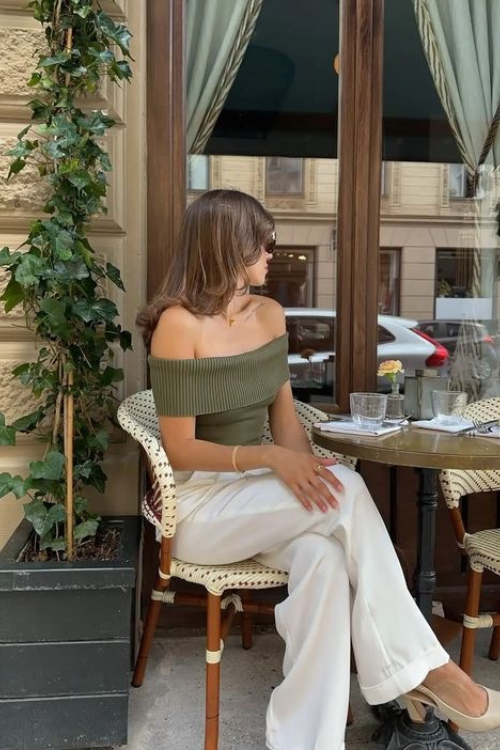 Off-shoulder silhouettes never fail to give a soft, feminine touch. Combine with flowy pleated pants for an elegant, breezy ensemble.