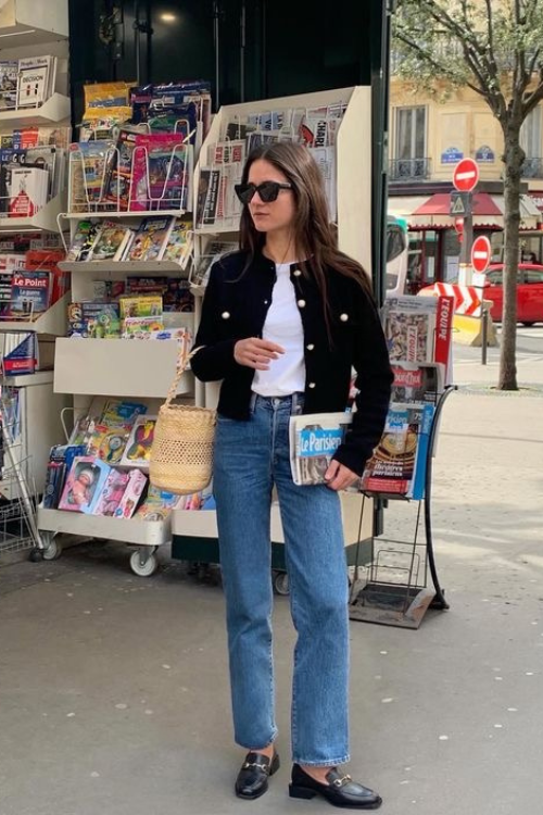 A cropped tweed jacket instantly elevates everyday denim. It’s perfect for city days when you want to look composed without trying too hard. Choose high-rise jeans to meet the jacket’s hemline for a flattering finish.