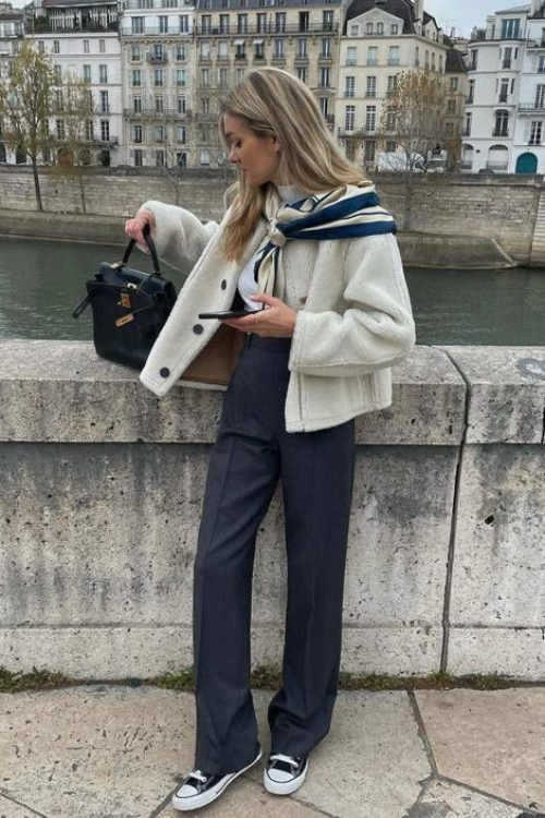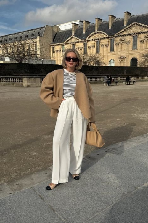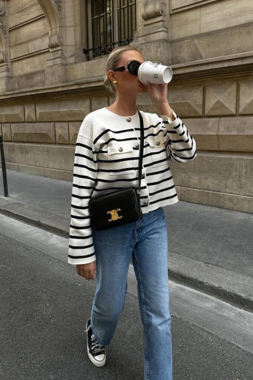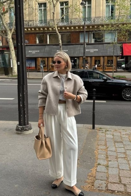 A jacket layered over a striped tee with wide-leg pants feels undeniably French because it mixes classic prints with tailoring. This look suits anyone who appreciates balance between fitted and fluid.