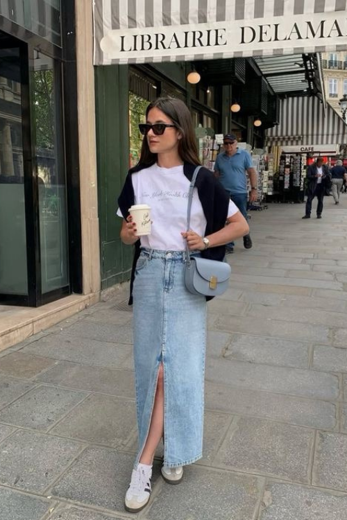 A basic tee with a denim skirt feels effortless, but proportion is what makes it chic. This look suits anyone who loves minimalist staples with subtle personality.