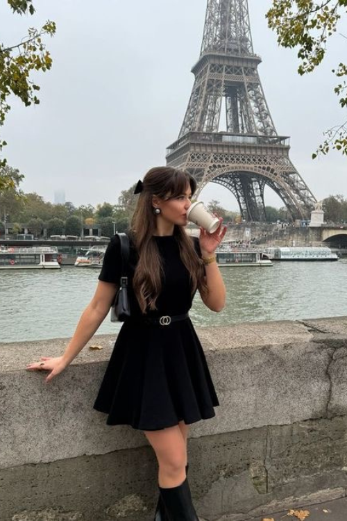 A flowy mini dress paired with long boots creates that perfect contrast between softness and edge. It works beautifully for cooler days when bare legs need balancing. Choose sleek, fitted boots and avoid overly bohemian prints to maintain that polished Paris vibe.