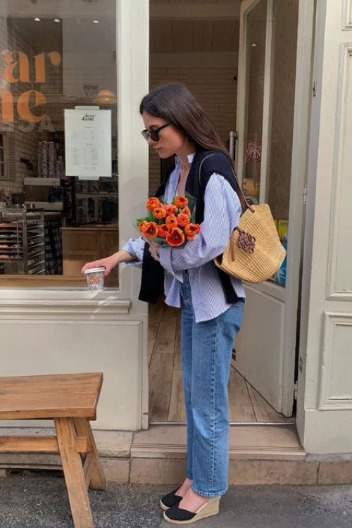 A striped shirt and straight-leg denim feel forever relevant, especially in a city known for classics. It’s ideal if you prefer simple formulas that always look intentional.