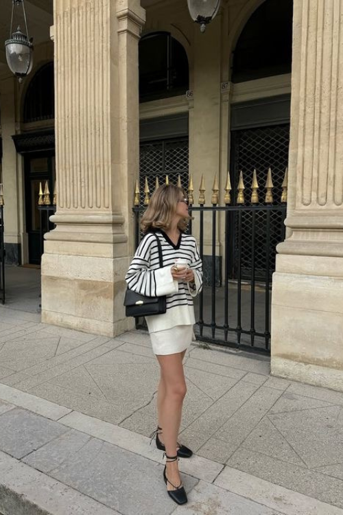 A striped jumper with a mini skirt balances cozy and playful beautifully. This pairing works well for in-between seasons when layering matters. Keep the knit lightweight and the skirt structured to avoid a bulky silhouette.