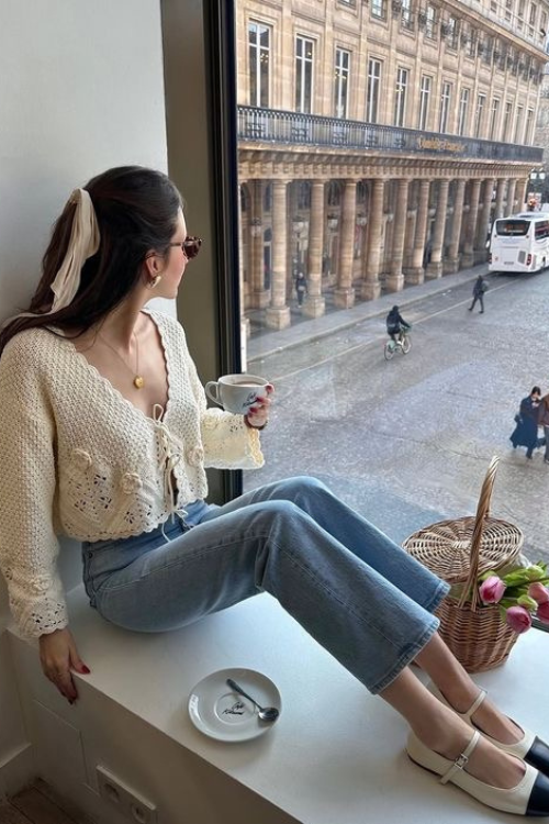 A crochet front-tie top adds texture and softness to classic denim. It’s ideal if you want something feminine without going overly romantic. Keep the denim clean and minimal so the crochet detail stands out naturally.