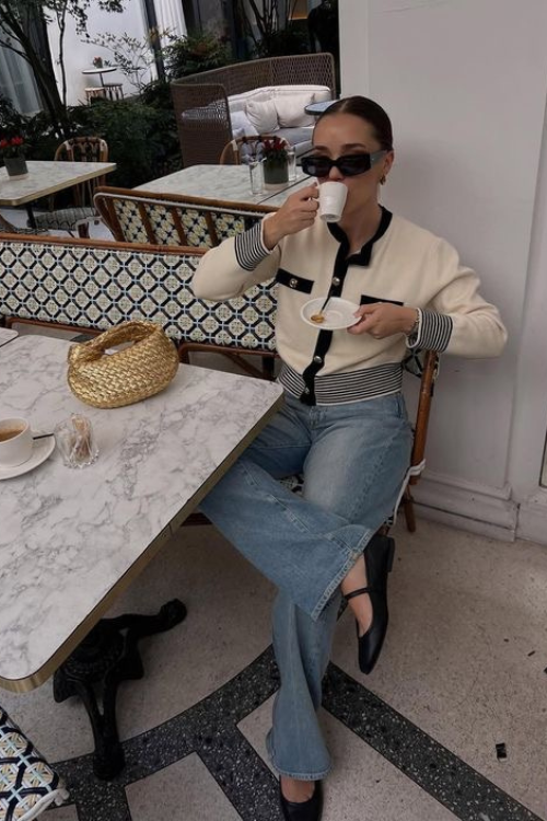 The contrast-trim cardigan adds that heritage detail Parisian outfits do so well, while tailored shorts keep it modern. It’s perfect for warmer days when you still want structure.