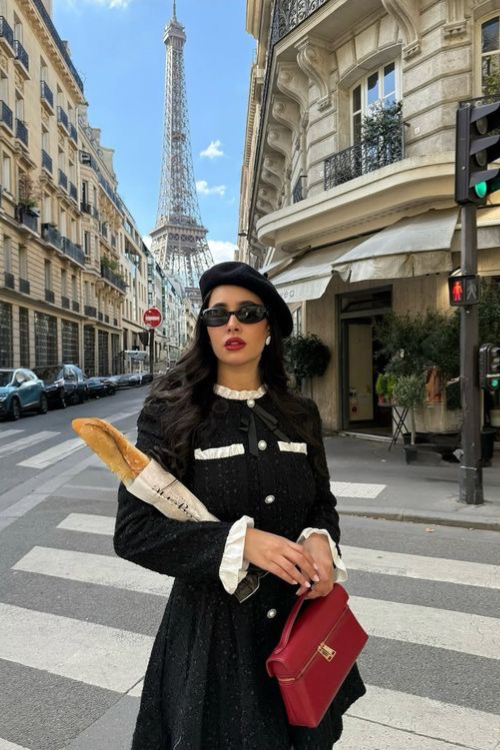 A Parisian-style mini dress styled with a beret and a red statement bag feels confident yet effortless. It’s perfect for brunches, galleries, or simply wanting to look like you belong on a cobblestone street.
