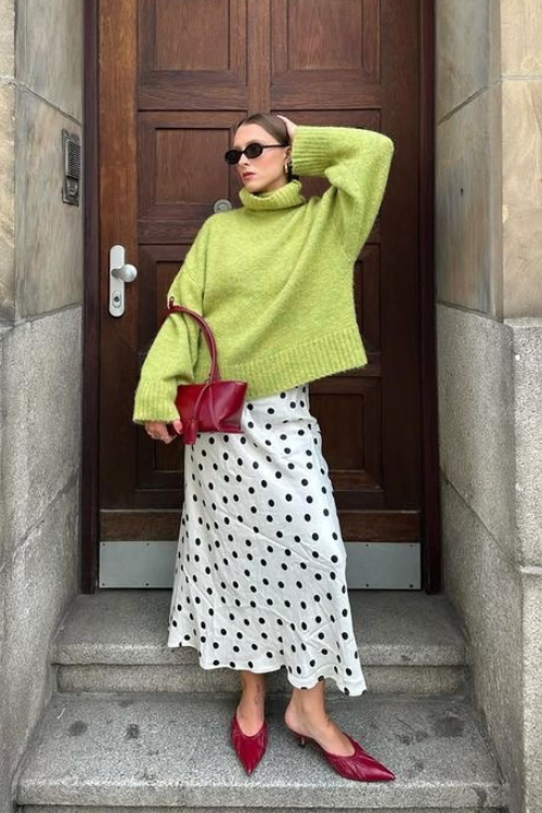 A turtleneck with a polka-dot skirt is your ticket to cozy sophistication. It’s simple yet always looks thought-out. Add pointed heels and gold hoops for that clean, Parisian finish.