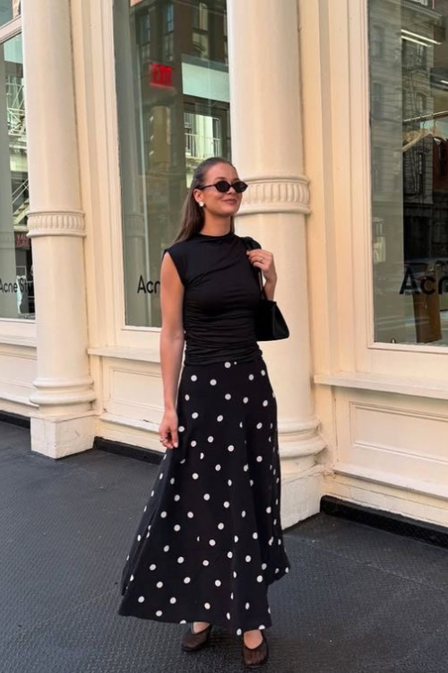 A flowy polka-dot maxi dress gives that effortlessly elegant vibe — perfect for brunches or garden parties.