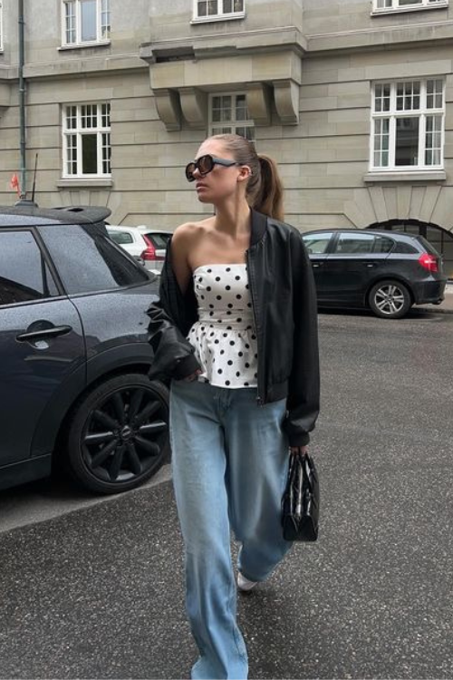 Edgy yet feminine — the leather jacket adds grit to your soft polka-dot look.
