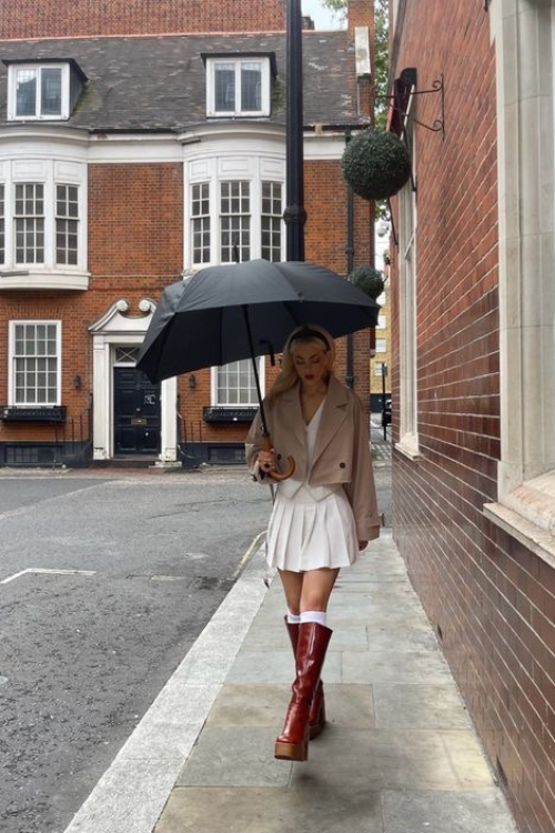 This pairing feels structured yet feminine, making it ideal for work or semi-formal settings. It works especially well on cooler rainy days. Stick to darker tones or prints that won’t show water spots easily.
