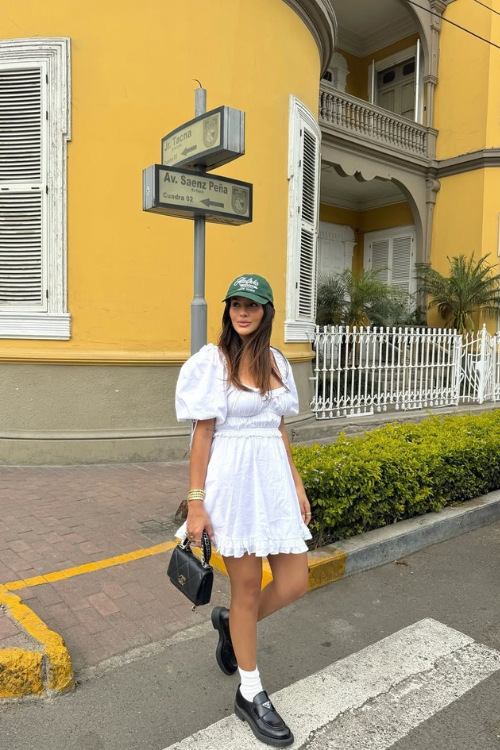 A white tee and ruffle mini skirt combination keeps the outfit playful, while green sneakers and a baseball cap bring in that casual St. Patrick’s Day energy.