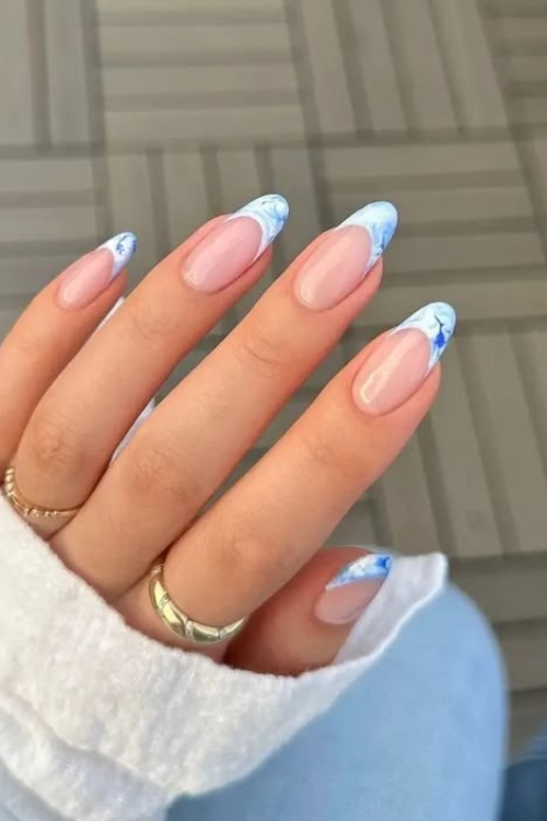 Blue marble french tips are the design equivalent of a well-cut linen dress — understated, clearly expensive, and completely effortless. The marble effect on the tip replaces the usual white with a swirling blue-and-white pattern that is simultaneously calm and interesting, which is a difficult balance to achieve in nail art.